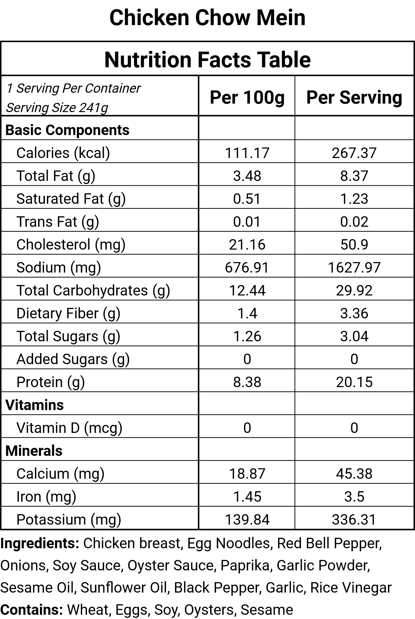 Ingredients - Chicken, Paprika, Pepper, Garlic Powder, Soy Sauce [Water, Soybean, Salt, Wheat Flour, Sugar, Colour-Plain Caramel, Salt, Acidity Regulators (Citric Acid, Lactic Acid, Preservative, Potassium Sorbate), Flavour Enhancers (E631 and E627)], Sesame Oil, Sunflower Oil, Red Onion, Red Pepper, Green Pepper, Garlic, Sesame Seeds, Chilli, Spring Onion, Mushroom Sauce [Water, Sugar, Soy sauce (Water Soya beans, Salt, Corn Starch), Salt, Modified Corn Starch, Yeast Extract, (Yeast Extract, Salt, Water), Colour (Plain Caramel), Dried Shiitake)], Rice Vinegar [Water, Rice, Salt, Acidity], Noodles [Wheat Flour, Water, Salt, Natural Colouring (Beta Carotene and Turmeric)].
