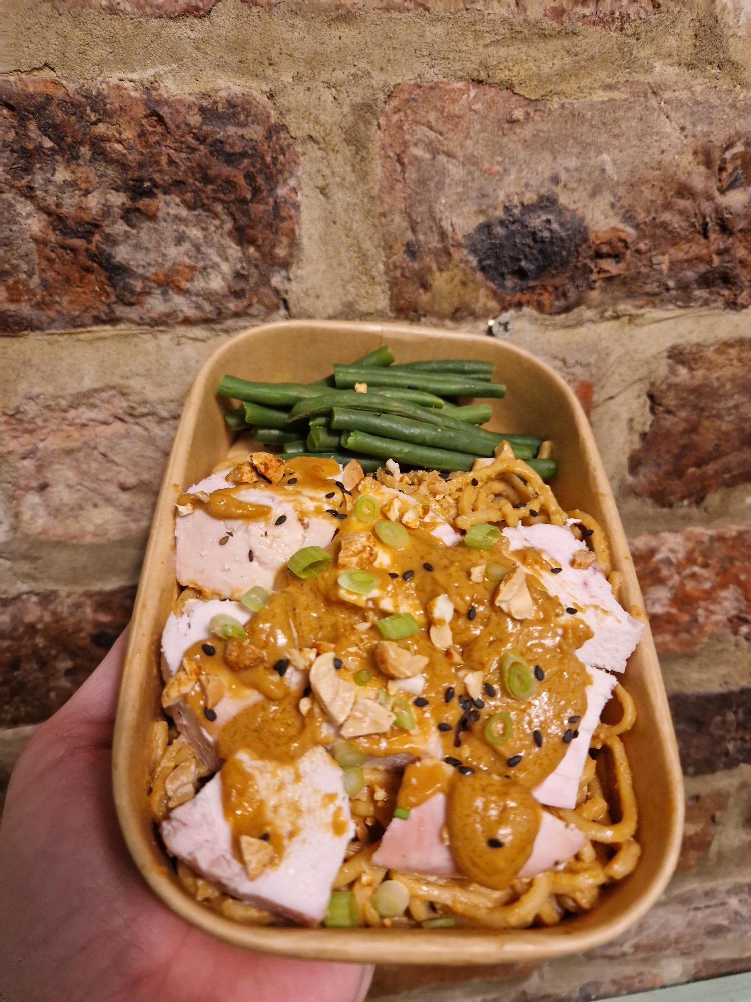 Ingredients - Chicken, Chilli Flakes, Sriracha [Chilli, Salt, Acidity Regulator (Acetic Acid), Sugar, Garlic, Salt, Thickener (Modified Starch, Xanthum Gum), Acidity Regulator (Citric Acid), Flavour Enhancer (Yeast Extract), Preservative (Potassium Sorbate), Colour (Paprika, Oleoresin)], Coconut Milk [Coconut Extract, Water, Stabilisers (Cellulose Gum, Emulsifier Polysorbate 60, Guar Gum)], Peanut Butter [Peanuts, Palm Oil, Sugar, Peanut Oil, Salt], Curry Powder, Tamari [Soybeans, Salt, Spirit Vinegar], Honey, Lime, Spring Onions, Sesame Seeds, Noodles [Wheat Flour, Water, Salt, Natural Colouring (Beta Carotene and Turmeric).