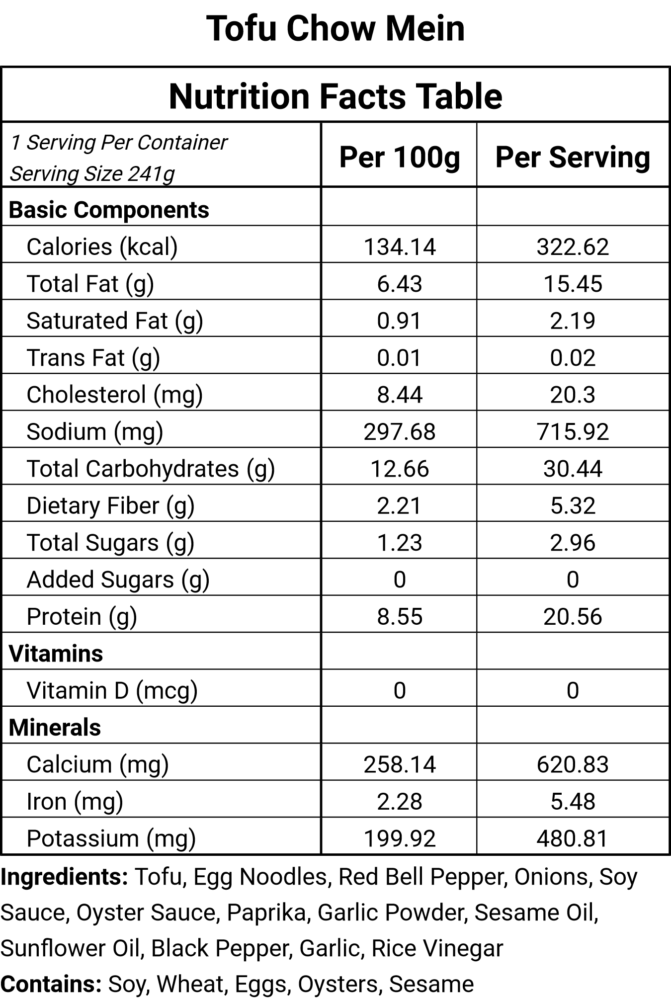 Ingredients - Tofu [Water, Soya Beans, Nigari], Paprika, Pepper, Garlic Powder, Soy Sauce [Water, Soybean, Salt, Wheat Flour, Sugar, Colour (Plain Caramel), Salt, Acidity Regulators (Citric Acid, Lactic Acid), Preservative (Potassium Sorbate), Flavour Enhancers (E631 and E627], Sesame Oil, Sunflower Oil, Red Onion, Red Pepper, Green Pepper, Sesame Seeds, Spring Onion, Garlic, Rice Vinegar [Water, Rice, Salt, Acidity), Mushrooms Stir Fry Sauce [Water, Sugar, Soy sauce (Water, Soyabeans, Salt, Corn Starch), Salt, Modified Corn Starch, Yeast Extract, Colour (Plain Caramel), Dried Shiitake], Noodles [Wheat Flour, Water, Salt, Firming Agents (Potassium Carbonate), Turmeric Powder].