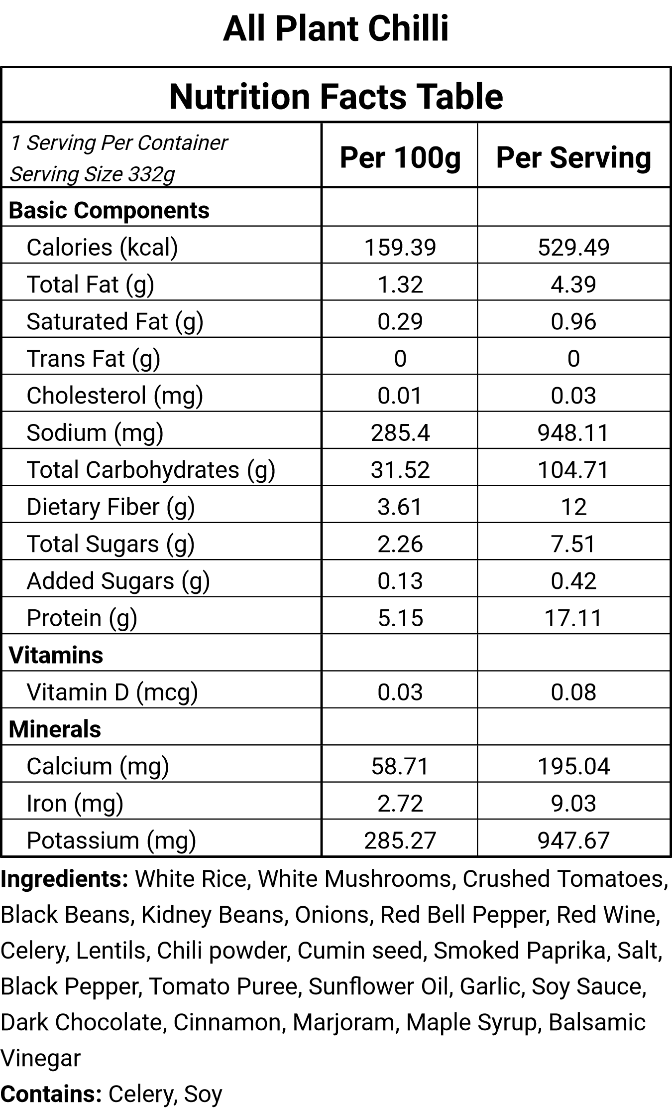 Ingredients - Mushrooms, Sunflower Oil, Salt, Black Pepper, Red Onion, Garlic, Red Chilli, Celery, Red Pepper, Tomato Puree, Red Wine, Tamari [Soybeans, Salt, Spirit Vinegar], Balsamic Vinegar, Tomatoes, Black Beans, Red Kidney Beans, Puy Lentils, Maple Syrup, Dark Chocolate [Cocoa Mass, Sugar, Cocoa Butter, Fat Reduced Cocoa Powder, Emulsifier (Sunflower Lecithins), Flavouring], Chilli Powder, Cumin, Smoked Paprika, Cinnamon, Oregano, Bay Leaf, Coriander, Rice, Chilli, Salt, Pepper.